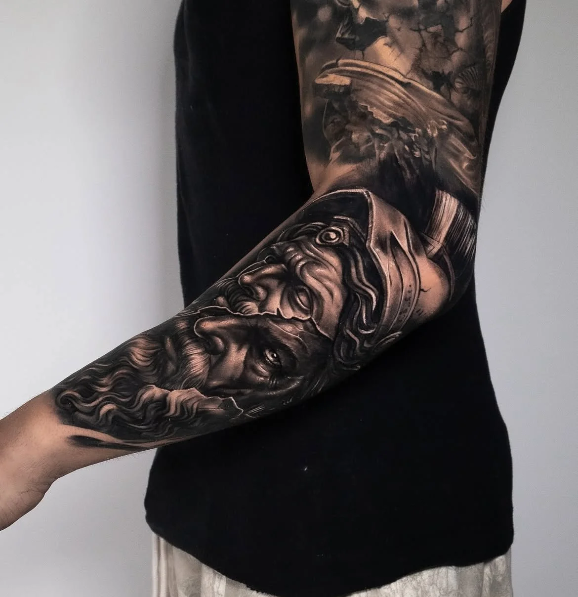 Realism is one of the strongest “masculine” forearm styles because it creates impact fast—portraits, animals, statues, clocks/roses, mythological figures, and cinematic shading.